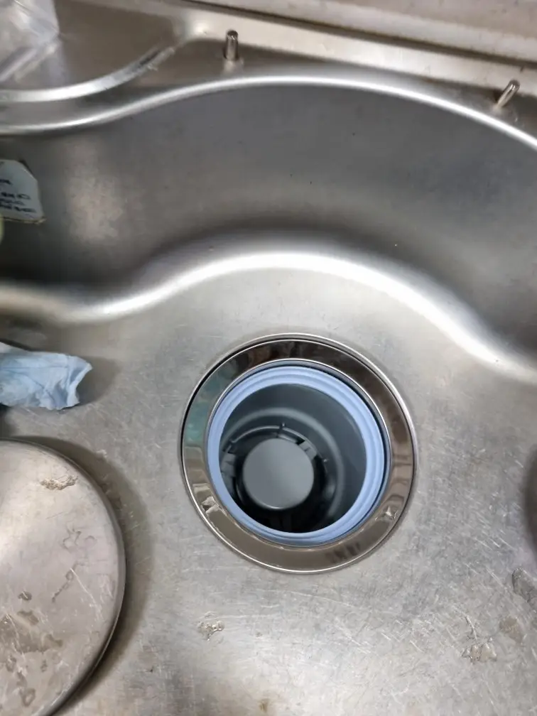 이번 교체에는 스테인리스 재질의 새 배수구통을 준비했습니다. 하단에는 두꺼운 실리콘 패킹이 포함되어 있어 누수 방지에 효과적이고, 내부는 탈착 가능한 스트레이너 구조라 청소도 편합니다. 설치 전 상판과 배수구통 접촉면에 방수 실리콘을 얇게 도포하고, 위에서 배수구통 본체를 넣은 뒤 아래쪽에서 고정너트를 손으로 가볍게 잠갔습니다. 위치를 정확히 잡은 후 스패너로 고정력을 조금 더해 주되, 지나치게 조여 상판이 휘지 않도록 주의했습니다. 여기에 기존 PVC 트랩과 연결되는 부분은 테프론 테이프를 감아 결합했고, S트랩이 바르게 정렬되도록 조절했습니다.